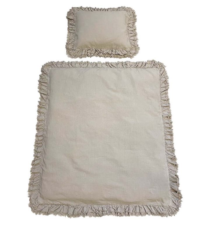Påslakanset från Mini Dreams med dubbel volang på fyra sidor som passar till spjälsäng.Material: 100% bomull Skötselråd: 60 graderStorlek: påslakan 100x130 cm, örngott 38x55 cm