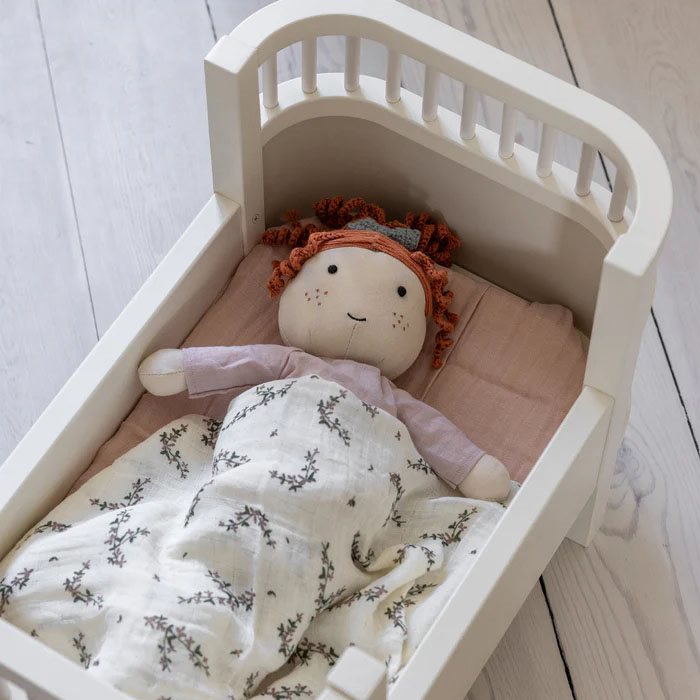 Docksäng med madrass från Sebra matchar Sebra sängen och har samma rundade hörn och utseende som den större sängen. Docksängen har inte de höga kanterna vilket gör det enkelt för små barn att lägga rätt dockorna i sängen.