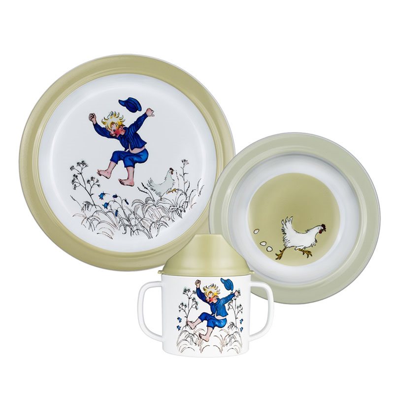 Fin barnservis i 3-delar från Rätt Start med Emil i Lönneberga motiv i BPA-fritt RPET plast. Pipmugg med spillsäkert lock, sugkoppstallrik och en platt tallrik med antiglidring i botten.