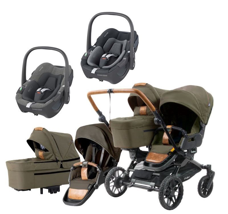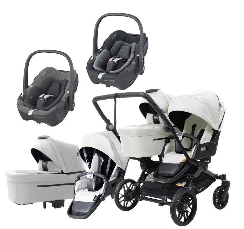 Här får du Emmaljunga Double Sento 2026 som tvillingvagn med två valfria sittdelar, två liggdelar+, samt två Maxi-Cosi Pebble 360 babyskydd! Välj fritt vilka färger du önskar.